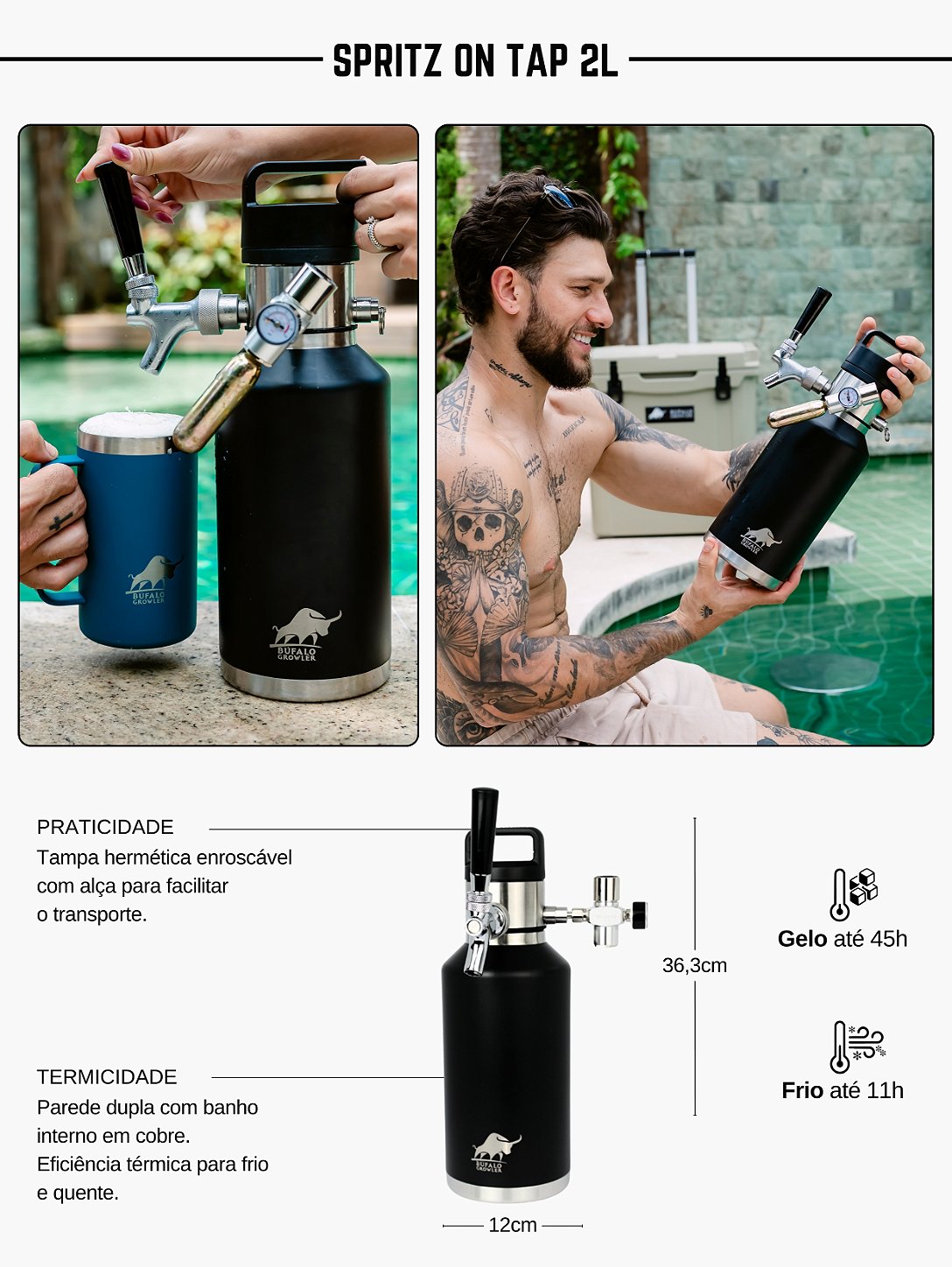 A Búfalo Spritz On TAP 2L é construída em aço inoxidável 304 sendo 18% de cromo e 8% de níquel o que confere maior resistência a oxidação, sendo o revestido com tecnologia Powder Coating (Pintura eletrostática a pó), o que proporciona maior durabilidade para a pintura.