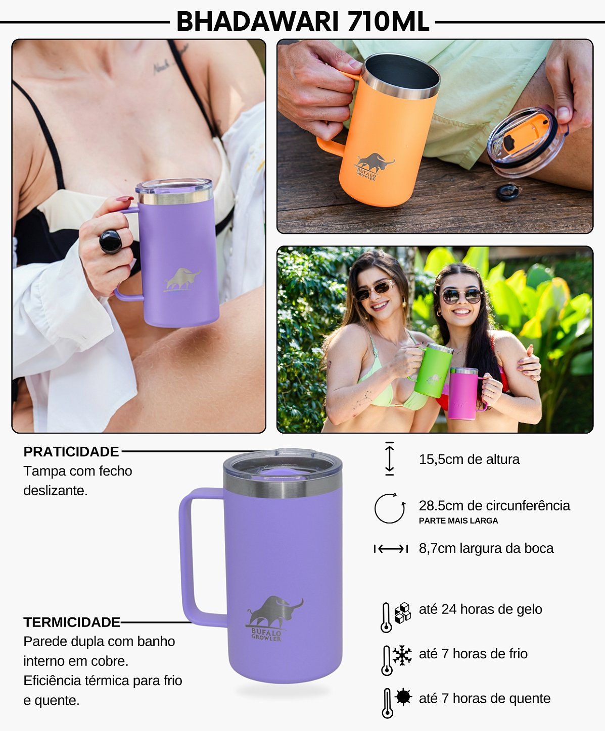 A Caneca Bhadwari 710ml  é  construído em aço inoxidável 304 sendo 18% de cromo e 8% de níquel o que confere maior resistência a oxidação, sendo o revestido com tecnologia Powder Coating (Pintura eletrostática a pó), o que proporciona maior durabilidade para a pintura.