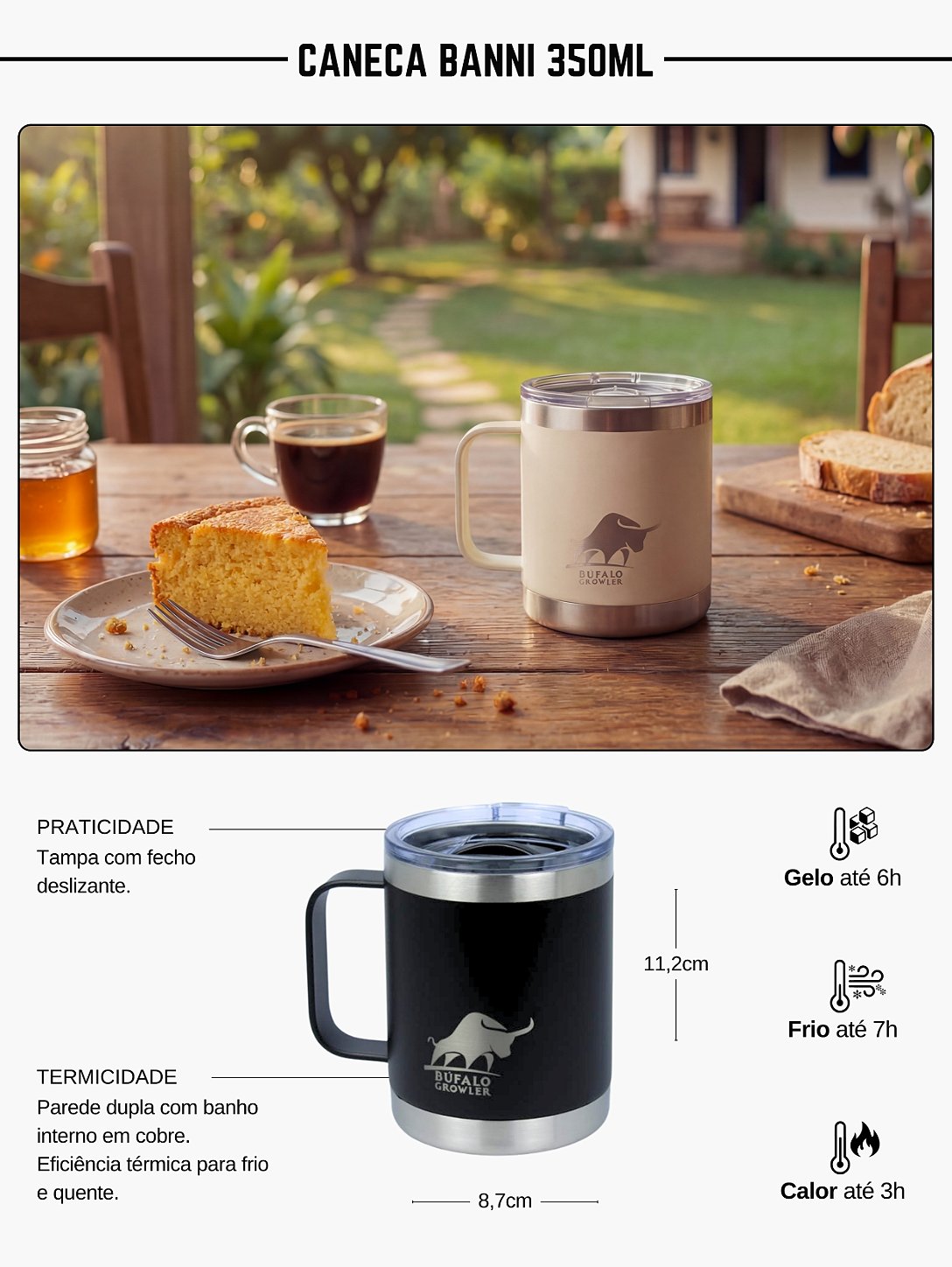 - Aço inox 18/8 com parede dupla e banho interno em cobre para melhor isolamento térmico