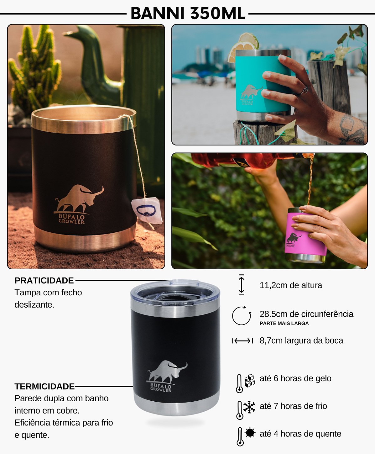 O Copo Banni de 355ml é construído em aço inoxidável 304 sendo 18% de cromo e 8% de níquel o que confere maior resistência a oxidação, sendo o revestido com tecnologia Powder Coating (Pintura eletrostática a pó), o que proporciona maior durabilidade para a pintura.