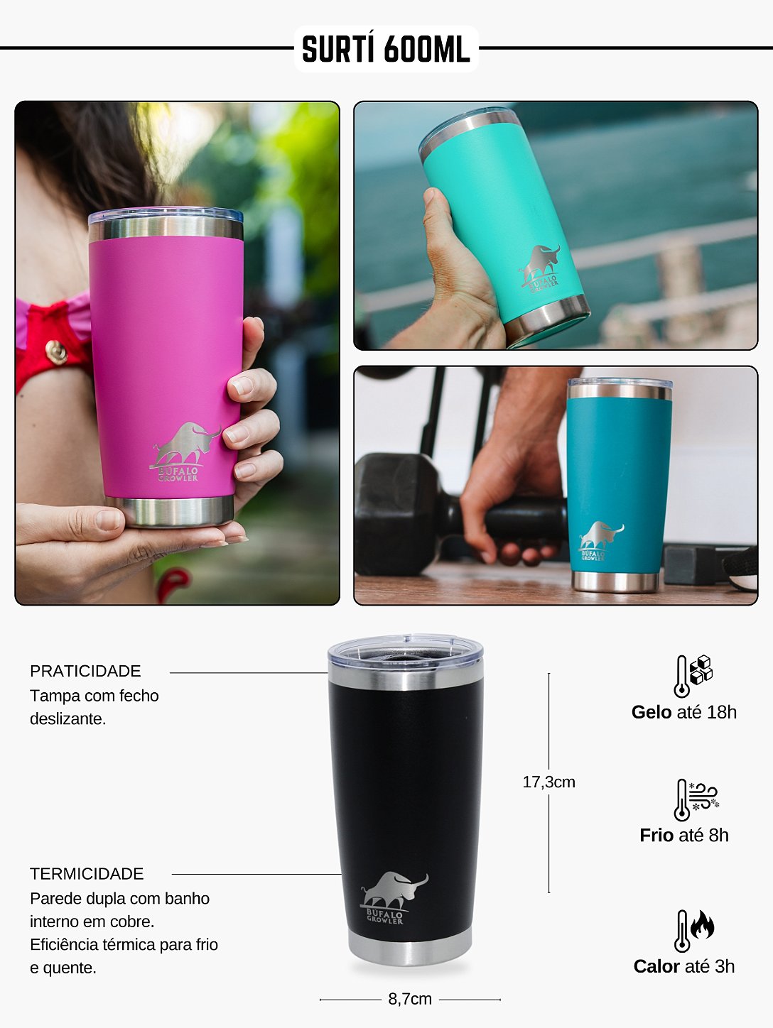 - Isolamento a vácuo que mantém a temperatura e evita suor