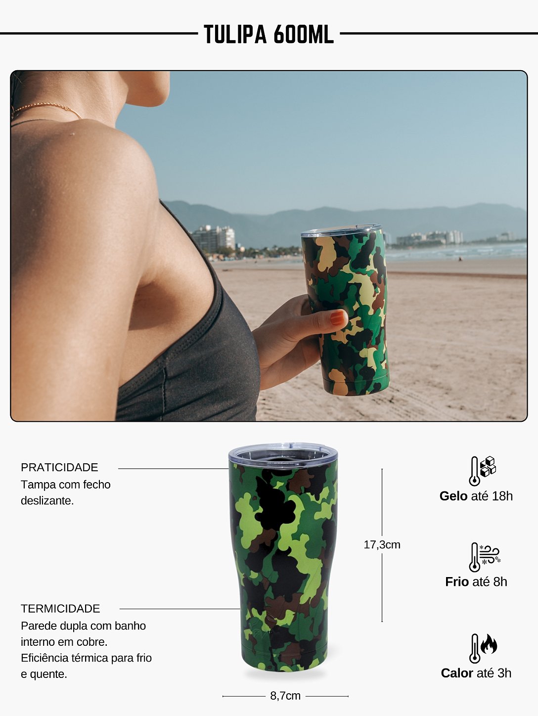 O Copo Tulipa de 600ml  é  construído em aço inoxidável 304 sendo 18% de cromo e 8% de níquel o que confere maior resistência a oxidação, sendo o revestido com tecnologia Powder Coating (Pintura eletrostática a pó), o que proporciona maior durabilidade para a pintura.