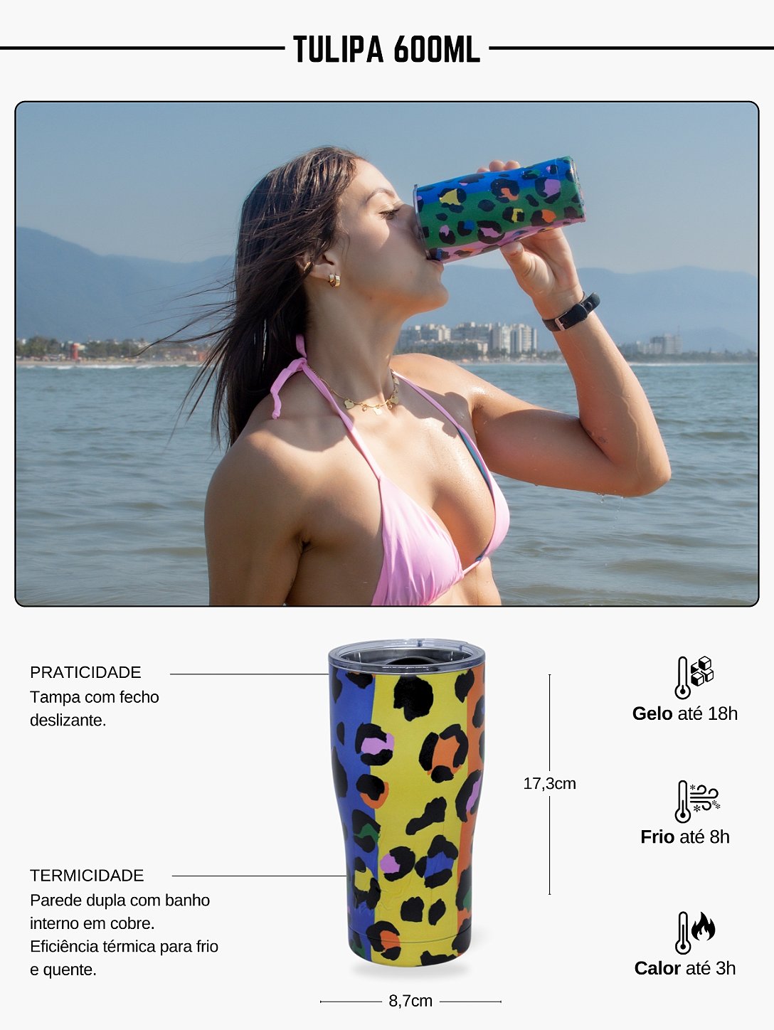 - Isolamento a vácuo que mantém a temperatura e evita suor