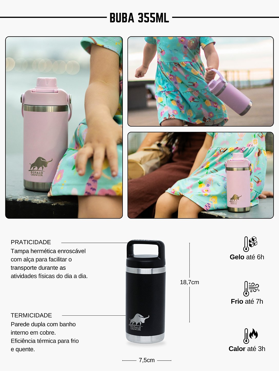 A Garrafa Buba 355ml é construída em aço inoxidável 304 sendo 18% de cromo e 8% de níquel o que confere maior resistência a oxidação, sendo o revestido com tecnologia Powder Coating (Pintura eletrostática a pó), o que proporciona maior durabilidade para a pintura.