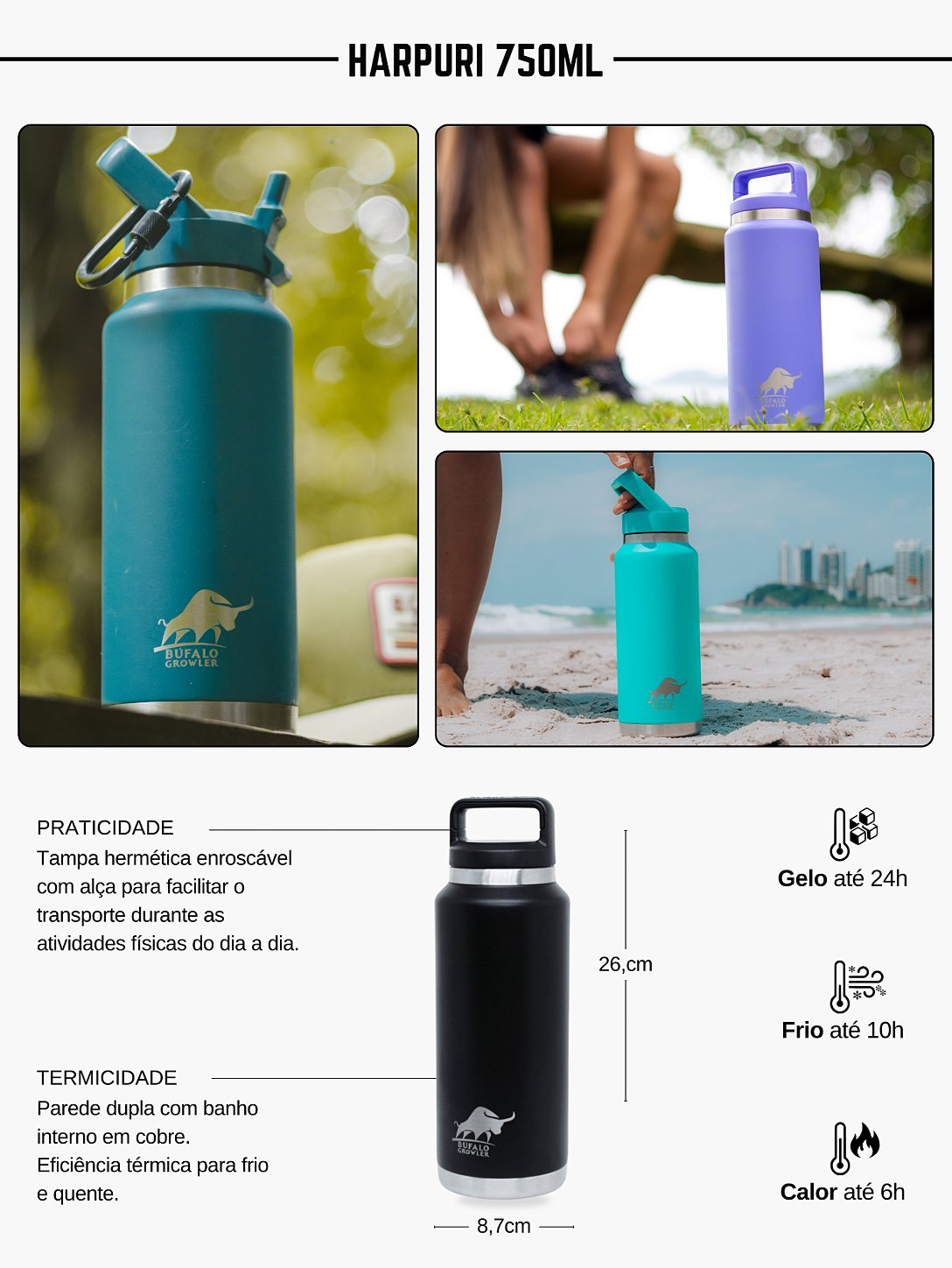 A Garrafa Harpuri de 750ml é construída em aço inoxidável 304 sendo 18% de cromo e 8% de níquel o que confere maior resistência a oxidação, sendo o revestido com tecnologia Powder Coating (Pintura eletrostática a pó), o que proporciona maior durabilidade para a pintura.