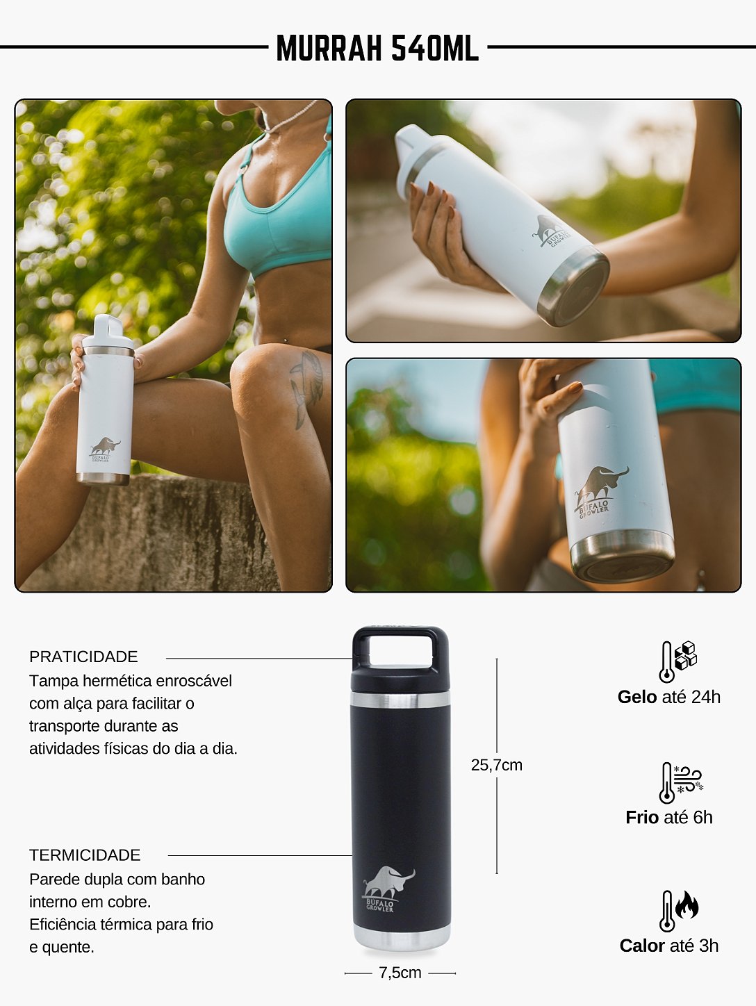 A Garrafa Murrah 540ml é construída em aço inoxidável 304 sendo 18% de cromo e 8% de níquel o que confere maior resistência a oxidação, sendo o revestido com tecnologia Powder Coating (Pintura eletrostática a pó), o que proporciona maior durabilidade para a pintura.