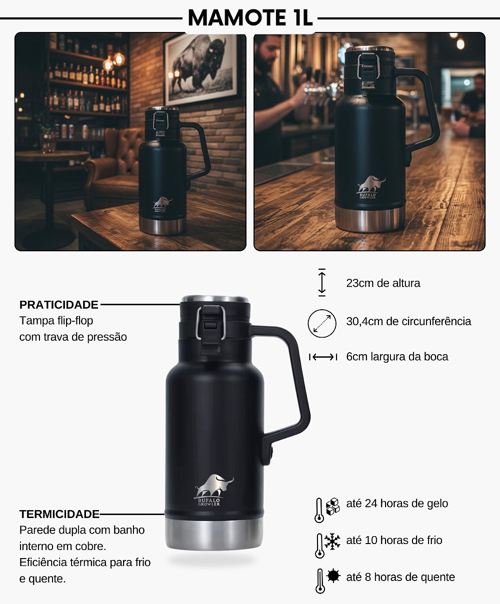 O Growler Carabao Mamote 1L é construído em aço inoxidável 304 sendo 18% de cromo e 8% de níquel o que confere maior resistência a oxidação, sendo o revestido com tecnologia Powder Coating (Pintura eletrostática a pó), o que proporciona maior durabilidade para a pintura e reduz possível descasque. Os térmicos possuem parede dupla com isolamento a vácuo que além de aferir a capacidade térmica evitam que a parede externa venha a suar. (Anti-condensação).