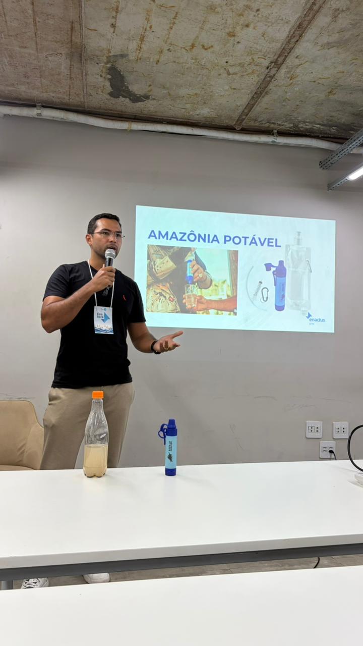 Encerrando a palestra, apresentei a iniciativa Amazônia Potável — um negócio de impacto que desenvolve filtros portáteis à base de membrana de fibra oca, capazes de remover bactérias e protozoários causadores de doenças de veiculação hídrica.