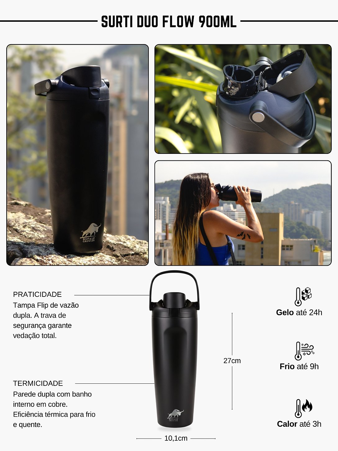 O Copo Surtí Duo Flow 900ml é construído em aço inoxidável 304 sendo 18% de cromo e 8% de níquel o que confere maior resistência a oxidação, sendo o revestido com tecnologia Powder Coating (Pintura eletrostática a pó), o que proporciona maior durabilidade para a pintura.